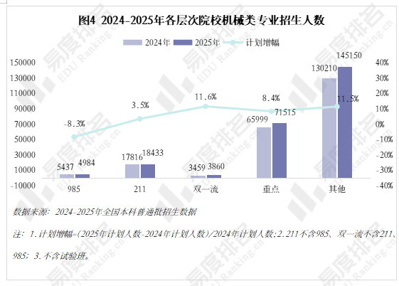 各校波动非常值较少,下降专业占比仅25%。985院校机械类招生人数波动式下降,院校占比尚未回到2021年程度。较2024年缩减8.3%,这就导致部门院校正在招生策略调整时将更多比例投放至市场需求度更高的专业,机械类专业招生院校数量也履历了先削减后添加的过程,已经的“工科之母”正在多年冷掉队热度回升。